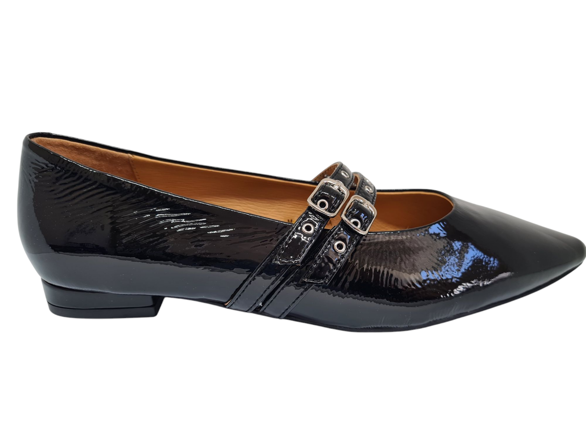 Aidan by Bresley is an elegant leather winter shoe in black patent leather with two straps across the top of the foot with metal eyelets and buckles.