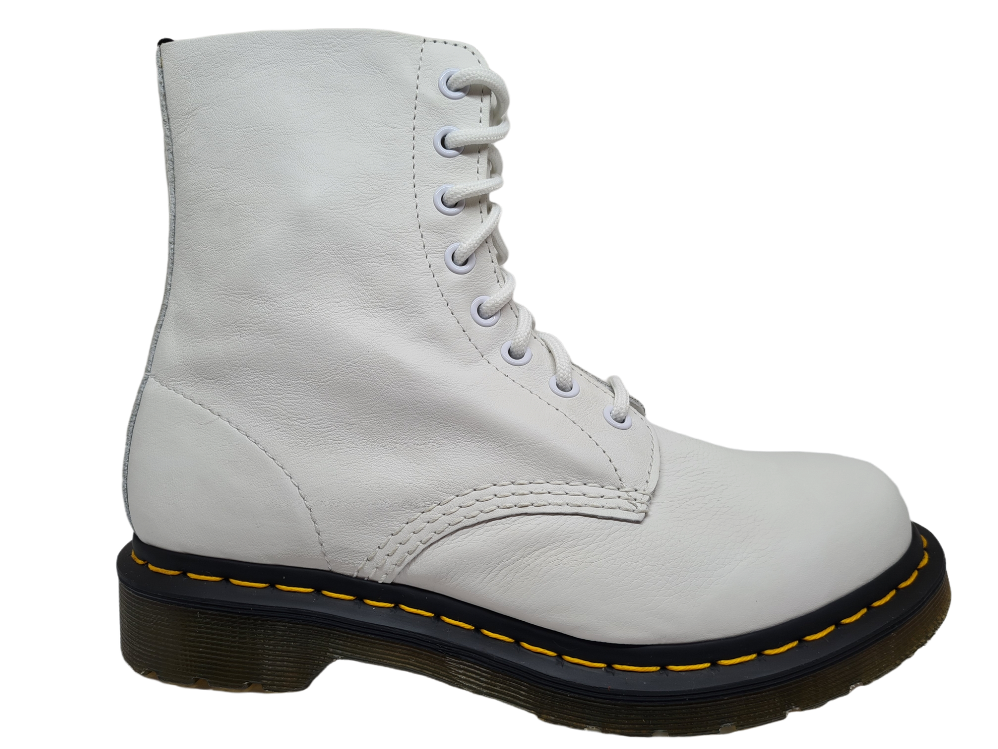 All the history and tough-girl durability of the original, iconic 8-eye Boot—offered in a variety of colours. This Pascal was constructed on our iconic Dr. Martens AirWair bouncing sole, that's oil-and-fat resistant with good abrasion and slip resistance—and has been since 1960. The women's 8-eye boot is Goodyear welted, meaning the upper and sole are sewn together in our heat-sealed z-welt stitch for enhanced comfort. The Pascal is made with Virginia, a soft, fine grained Nappa leather.