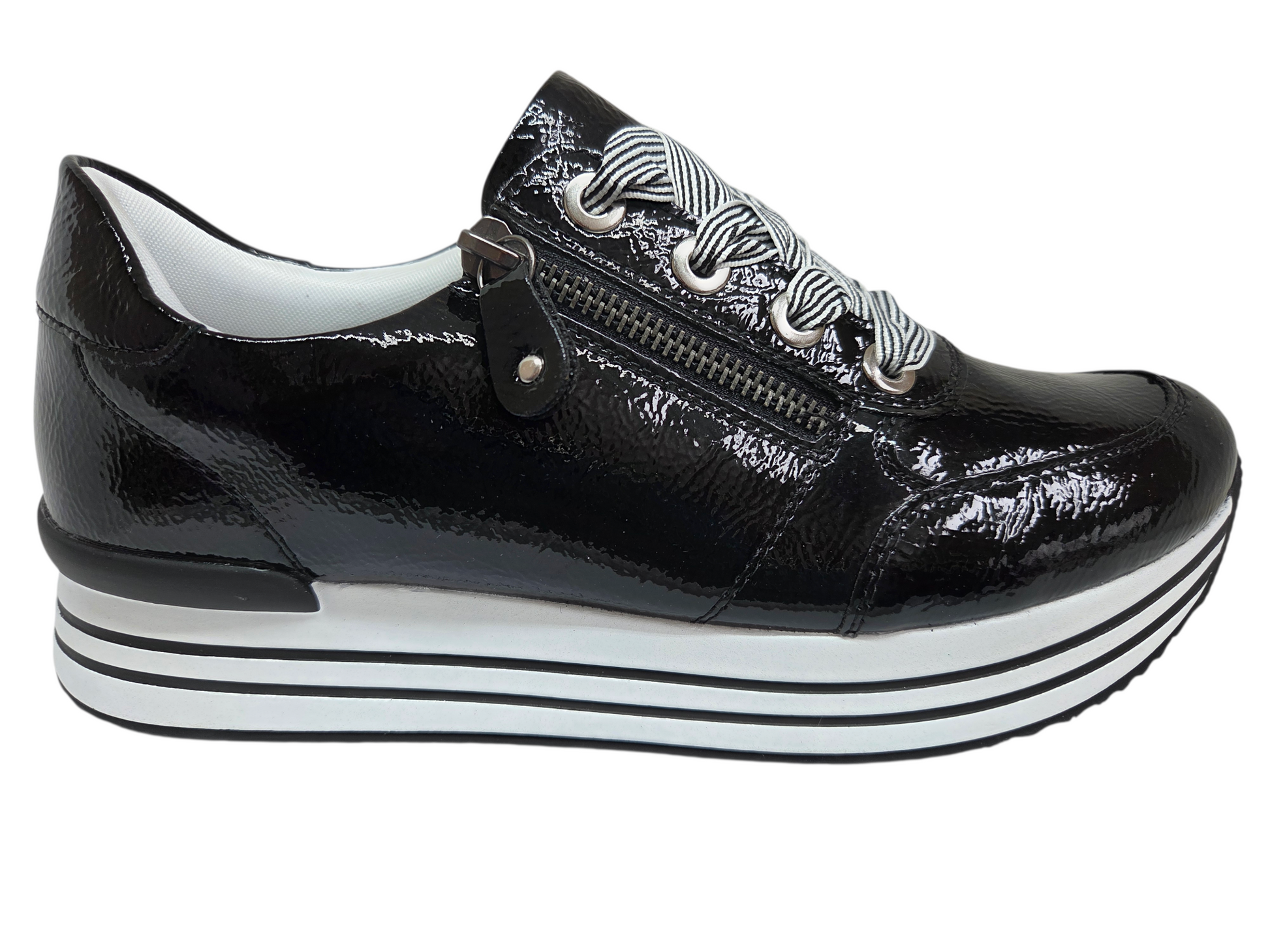 How can comfort be so stylish? These shiny black remonte sneakers for women made of patent leather are a real eye-catcher! The clever combination of zipper and lacing provides good support and allows you to put them on and take them off quickly. The black and white striped sole pattern is a beautiful eye-catcher. A removable footbed and the particularly light and flexible sole are great goodies on top. The inner lining made of micro velour is light and breathable.